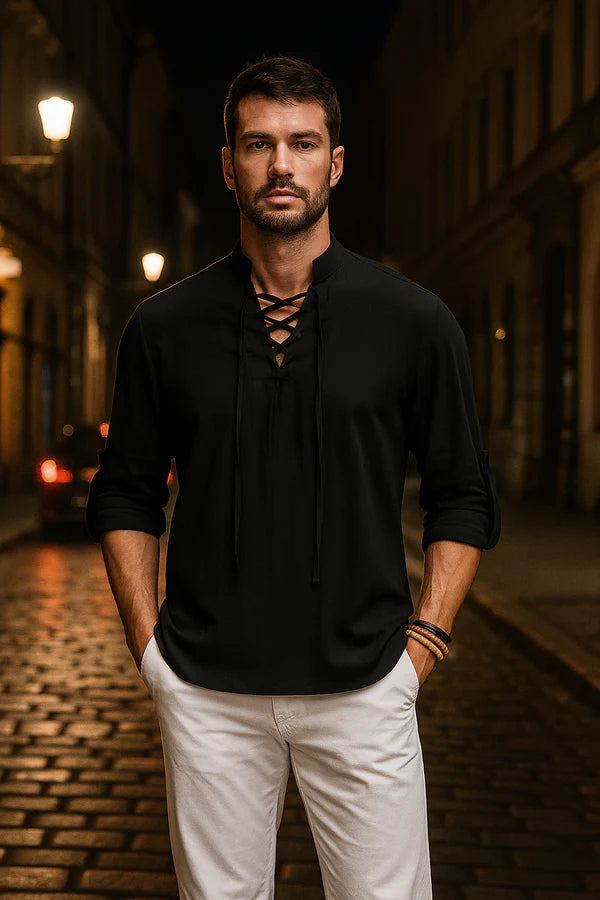 Het Monarch-overhemd met mao-kraag en vetersluiting voegt een verfijnde, moderne touch toe die echt opvalt.