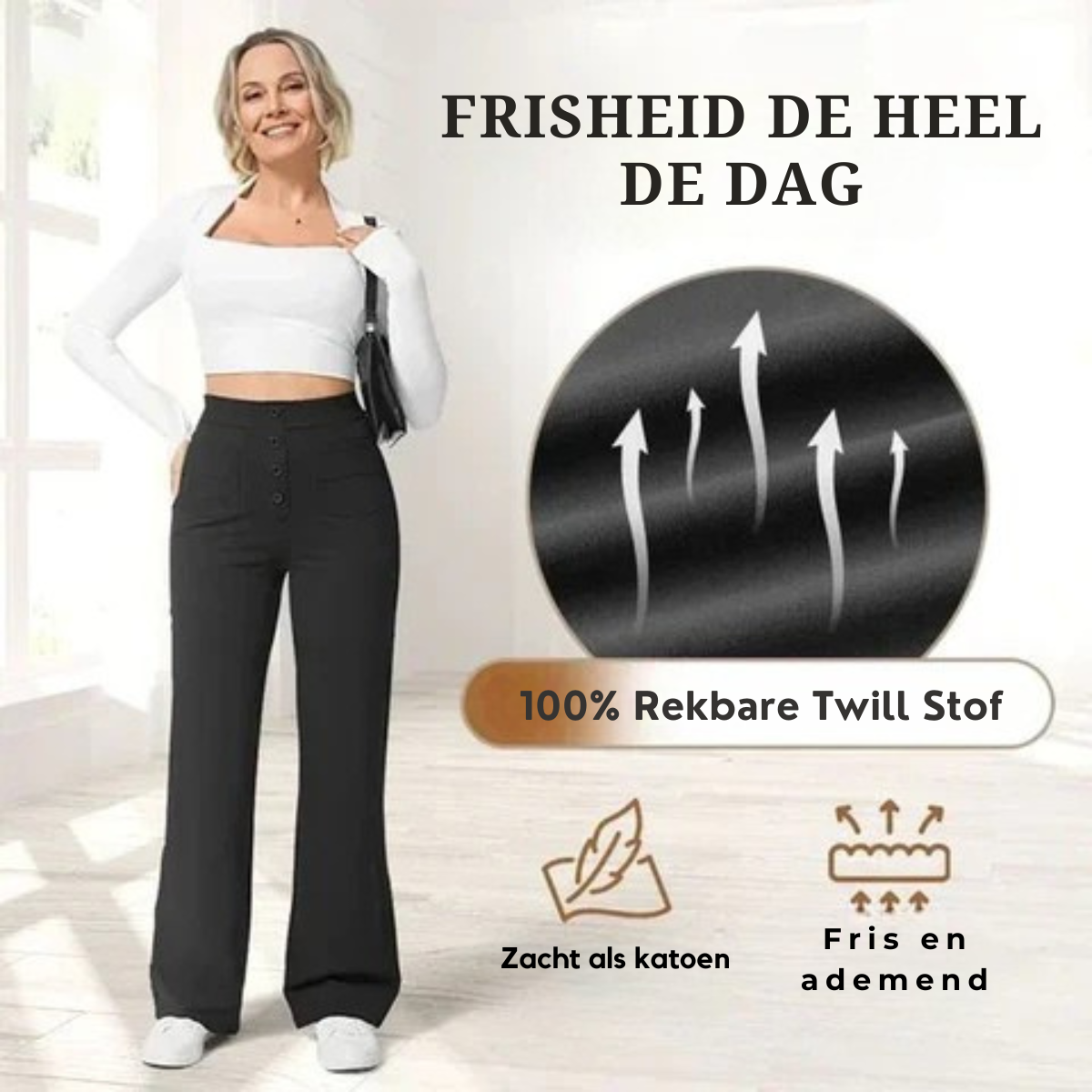 Dankzij hun 100% rekbare twill-stof bieden deze high-waist broeken optimale elasticiteit in alle richtingen, wat zorgt voor maximaal comfort bij al je activiteiten. Of je nu zit, buk of in beweging bent, de high-waist stretchbroek past zich perfect aan je bewegingen aan zonder druk uit te oefenen op de bovenkant van je lichaam, waardoor je volledige vrijheid en een gevoel van welzijn de hele dag door ervaart.