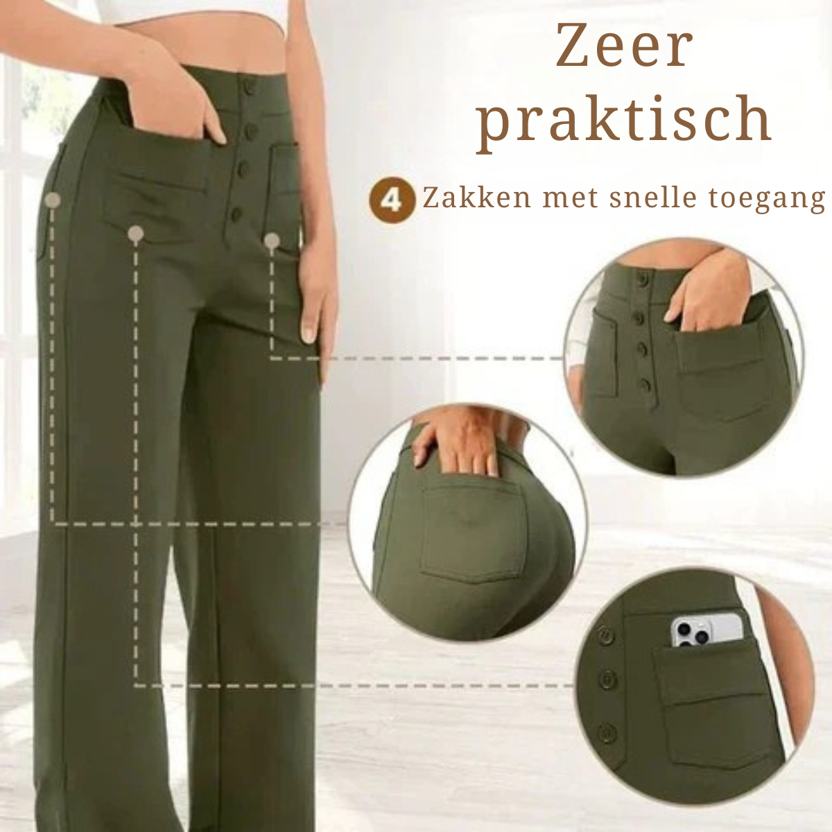 De 4 zakken van de high-waist stretchbroek bieden praktische en veilige opbergruimte, zodat je je essentiële spullen gemakkelijk kunt meenemen, waar je ook gaat. Of het nu voor een casual uitje of een werkdag is, deze zakken zijn ontworpen om je dagelijks leven in elke situatie te vergemakkelijken.