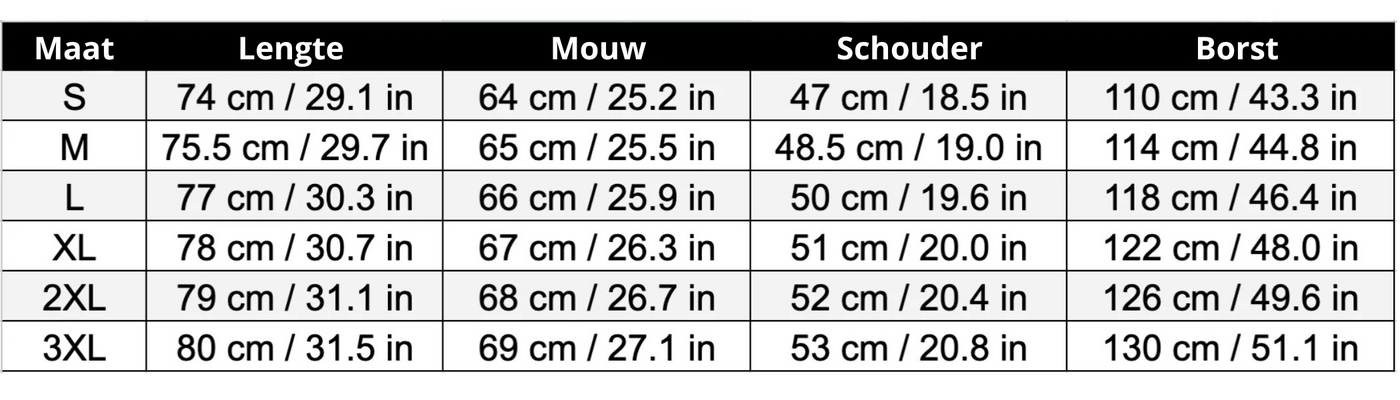 Het overhemd is beschikbaar in 6 maten (S, M, L, XL, XXL, XXXL). Raadpleeg de maattabel op de productpagina om de maat te kiezen die het beste bij u past.